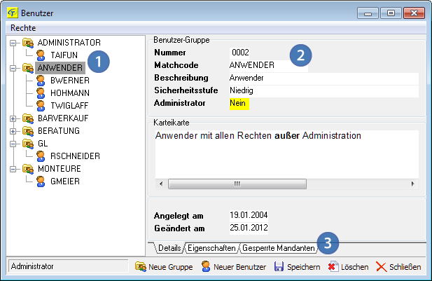 - Die Benutzerverwaltung ist jetzt besonders übersichtlich. Sie zeigt Benutzer-Gruppen und Benutzer in einer Baumstruktur an. Die Administration wird dadurch einfacher und komfortabler.
