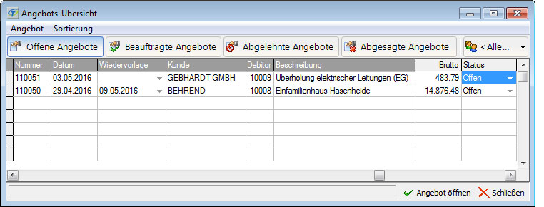 In der neuen Angebots-Übersicht werden alle Angebote mit dem aktuellen Bearbeitungsstand angezeigt. Damit behalten Sie Ihre Angebote stets im Blick und können sie sogar filtern, z. B. nach offenen oder abgelehnten Angeboten. So wird Ihre Kundenbetreuung noch effizienter!
