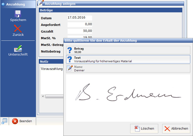 Erfassen Sie jetzt Anzahlungen direkt in Ihren Verkaufsaufträgen gleich beim Kunden vor Ort. Sie können Notizen hinzufügen und per Unterschrift die Zahlung quittieren.