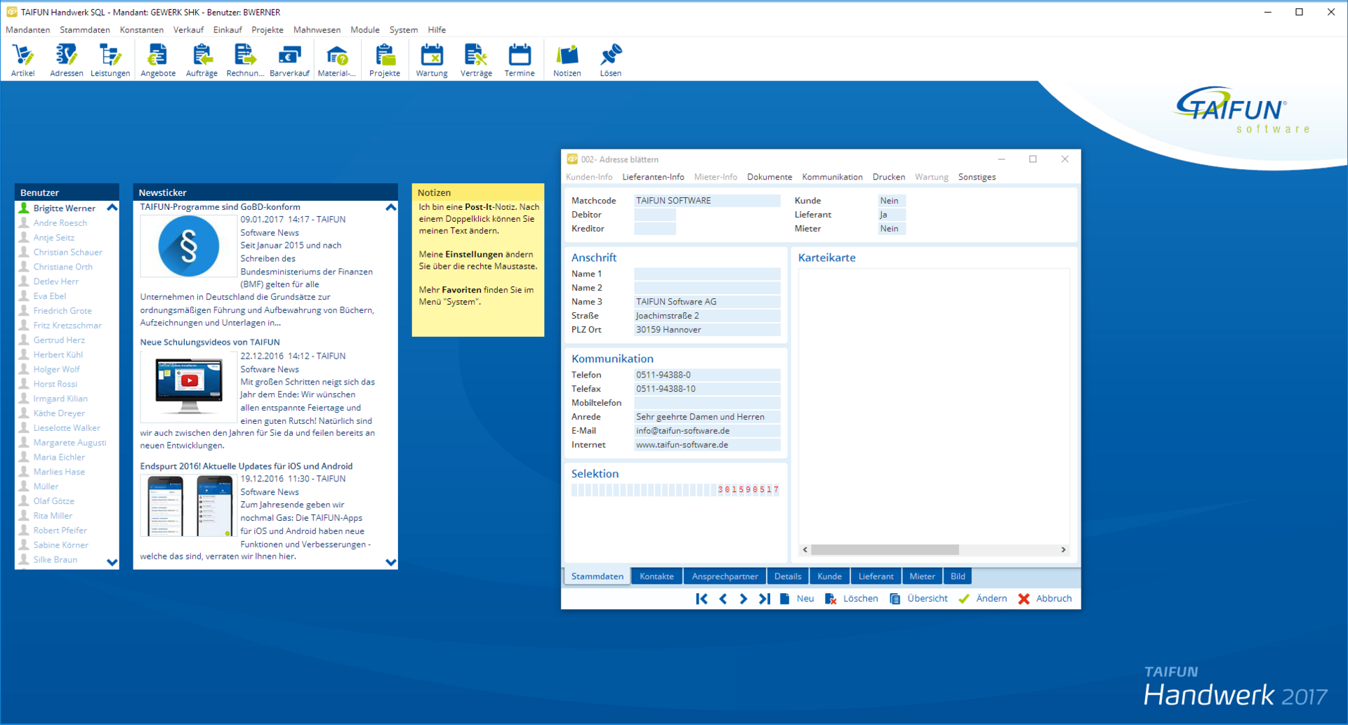 Die neue Version hat nicht nur in Sachen Funktion einiges zu bieten, sondern auch im Bereich Design hat sich viel getan: Alle TAIFUN-Programme und Zusatzmodule erstrahlen nun in neuem, modernen Design. Schlicht und einfach, in hellen Farben gehalten, um für Sie den besten Überblick und eine herausragende Nutzerfreundlichkeit zu gewähren. In Bedienung und Funktion bleibt TAIFUN genauso leistungsstark: Alle Menüpunkte, Funktionen und auch die Module befinden sich weiterhin an den bekannten Stellen.