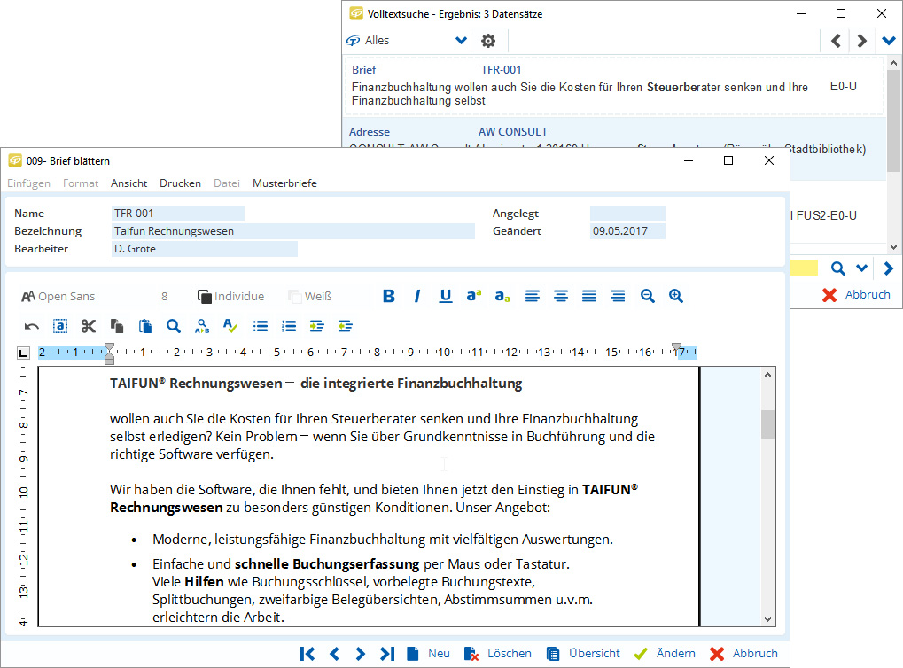 Wir haben unsere Volltextsuche TAIFUN openSearch erweitert: Ab sofort können Sie auch in allen Briefen, die in Ihrem TAIFUN erstellt und hinterlegt wurden, suchen.